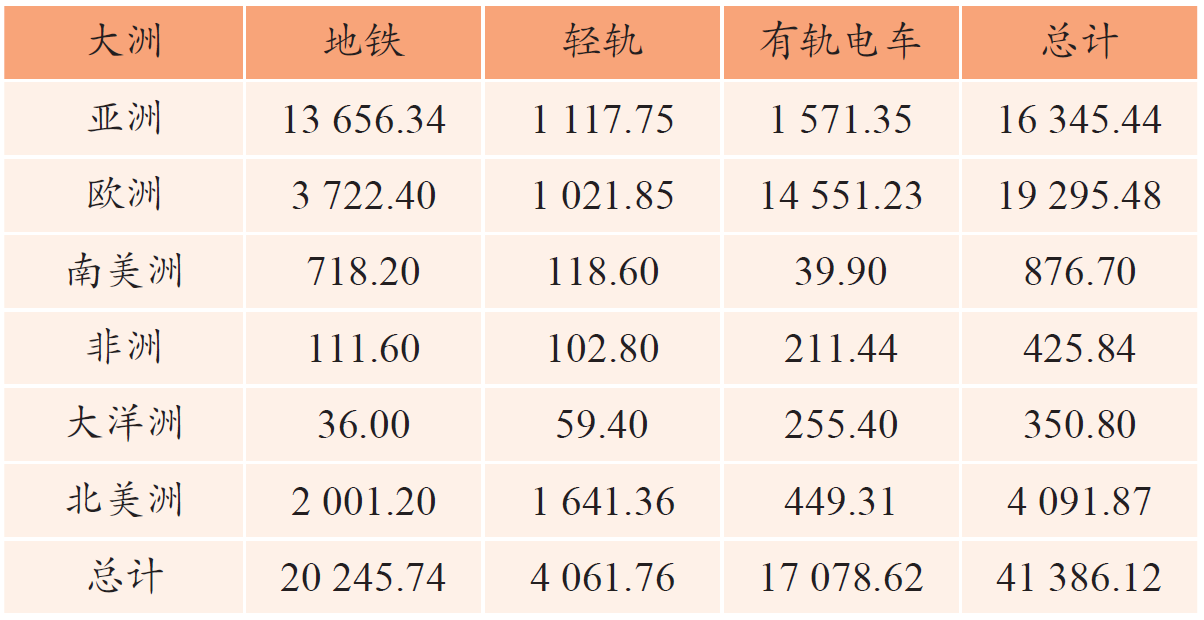 Figur 1 visar den övergripande omfattningen av stadstrafik över stora kontinenter i världen (Obs: Alla städer i Ryssland klassificeras i Europa för beräkning). Data indikerar att tunnelbanor och spårvagnar är de vanligaste typerna av stadstrafik globalt, och global stadstrafik är huvudsakligen koncentrerad till Eurasien, med tunnelbanor huvudsakligen distribuerade i asiatiska länder.[1]