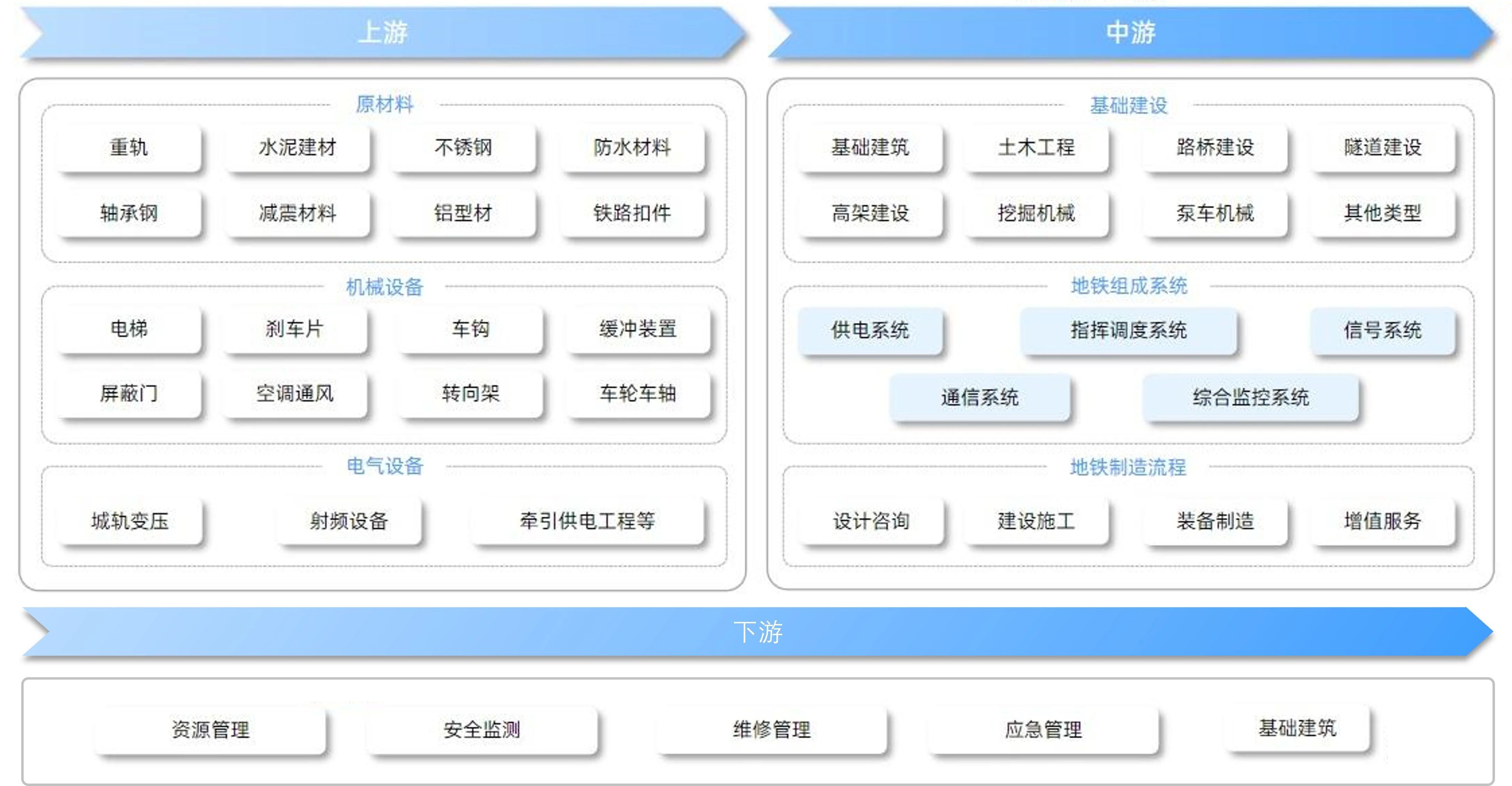 Järnvägstransitering förbinder stadsindustrier, främjar utvidgningen av industrikedjan och driver på den snabba utvecklingen av stödjande industrier som utrustningstillverkning och teknisk FoU. Tunnelbaneindustrins kedja visas i figur 3, där alla länkar är beroende av varandra och driver den ekonomiska utvecklingen av tätorter och storstadsområden.[2]
