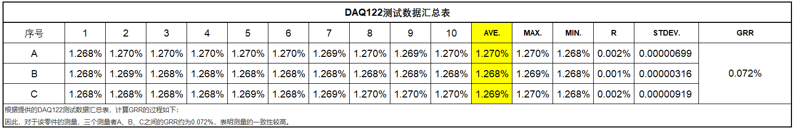 För att säkerställa att det valda datainsamlingskortet uppfyller kraven testade ME-teamet det. Analysen visar att det valda datainsamlingskortet har utmärkt stabilitet, med en GRR på cirka 0,072 % bland tre mätare A, B och C.