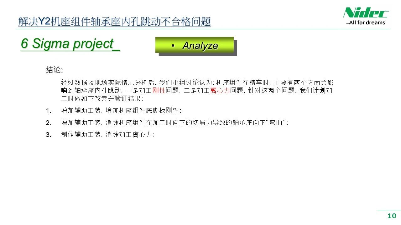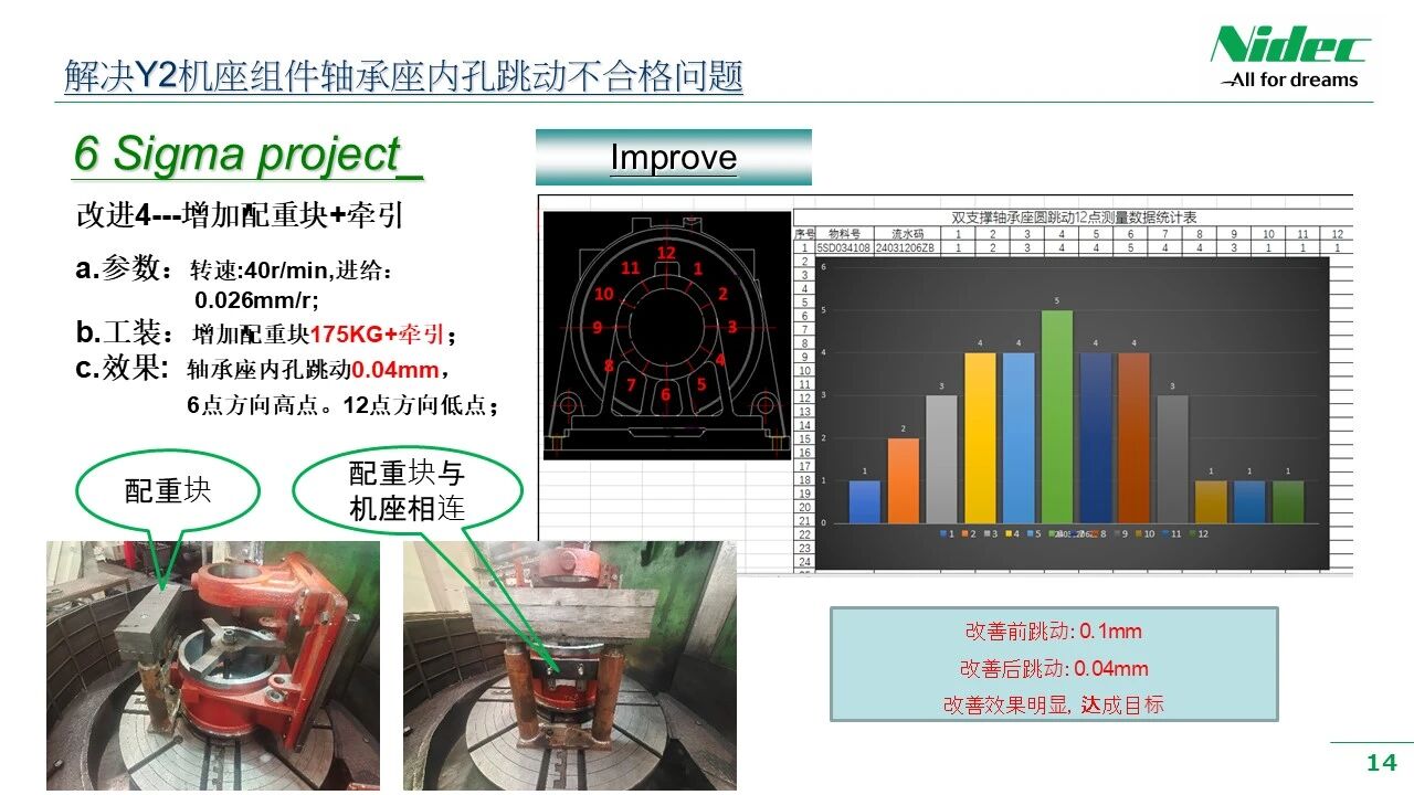 I enlighet med företagets kvalitetspolicy och ledningsfilosofi "tillfredsställa sig själv, tillfredsställa kunder, vara ärlig och pålitlig och sträva efter excellens", förser vi kontinuerligt kunderna med produkter med högre kostnadseffektivitet och mer stabil kvalitet. Nyligen, i bearbetningsverkstaden, har det funnits ett fenomen där nyckeldimensionerna eller geometriska toleranserna för vissa nyckelprocesser är instabila efter bearbetning och inte uppfyller 6 - Sigma-kontrollkraven. Bolagets ledning lägger stor vikt vid detta och har främjat verkstaden att inrätta en arbetsgrupp för kvalitetsförbättring av verkstäder. Denna arbetsgrupp består av ledare från relevanta avdelningar, relevanta ingenjörer, teamledare och produktionsanställda i frontlinjen. Genom att använda DMAIC-metoden 6 - Sigma förbättring har en omfattande kvalitetsförbättringskampanj lanserats. Genom en rad förbättringsaktiviteter såsom bakgrundsutredning, datainsamling, problemsammanfattning, orsaksanalys samt formulering av kortsiktiga och långsiktiga förbättringsåtgärder har kvalitetsförbättringsarbetet genomförts fullt ut. Denna förbättringsaktivitet har avsevärt förbättrat gräsrotschefers och anställdas praktiska förmåga att förstå, tillämpa och marknadsföra 6 - Sigma förbättringsverktygen på ett parallellt sätt. Det hjälper till att minska variationen och fluktuationerna i kvalitetsegenskaperna hos bearbetade delar, och förbättrar därigenom den övergripande tillverkningskvaliteten för motorer och hjälper till att förse kunderna med produkter av bättre kvalitet.